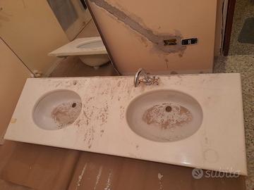 Piano in marmo bianco di Carrara per bagno in muratura con doppio lavabo in ceramica e fori per rubinetteria, in buonissime condizioni, appena smontato, profondità 55cm, lu ghezza 160cm circa. No perditempo, ritiro a breve, prezzo trattabile.