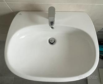 Lavabo nuovo della Ideal standard completo di miscelatore Hansgrohe, copri sifone (con fascette originali per il supporto), piletta e viterie per il fissaggio a muro.