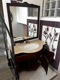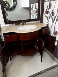 COMPOSIZIONE MOBILE IN LEGNO INTARSIATO L.104 XP.60 XH. 82 C/LAVABO SOTTOPIANO OVALE, SPECCHIO CON LUCI STELO BRONZO TOP MARMO BOTTICINO