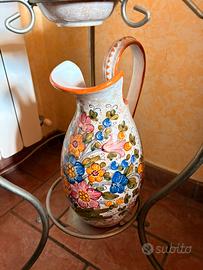 Splendido lavabo antico in ferro battuto con ceramiche di Deruta. Include un catino (la bacinella visibile nell'immagine), una brocca e un piattino portasapone.