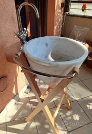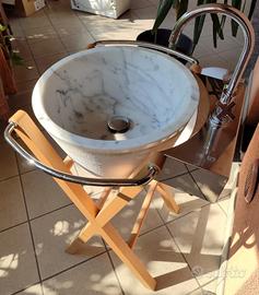 Vendo lavabo in marmo di Carrara molto particolare, tipo tinozza. Con struttura di appoggio in faggio, completo di rubinetto e appoggio in acciaio. Davvero molto resistente, come nuovo!