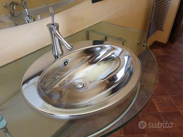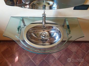 Lavabo sospeso in acciaio inox lucido con piano in vetro temprato completo di barra porta asciugamani. Dimensioni d'ingombro: profondità cm.59 - lunghezza cm.105