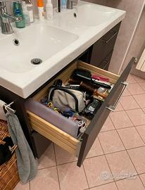 Mobile bagno con doppio lavabo, colore venghè. Quattro cassetti con chiusura ammortizzata. Compreso due rubinetti. Misure 120x85, profondità 49 escluso maniglie. Visionabile. Lo tolgo perche devo effettuare ristrutturazione