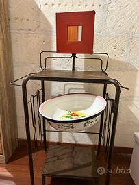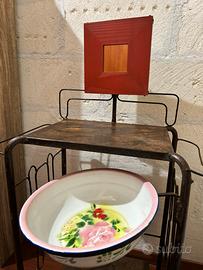 Lavabo in ferro smaltato e metallo, probabilmente di inizio/metà ’900, completo di specchietto e bacinella. Prezzo trattabile