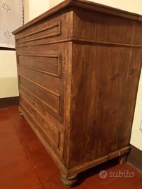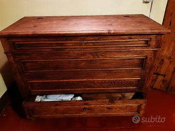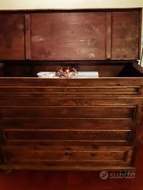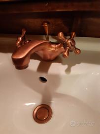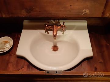 Madia fine '800 adattata per lavabo a scomparsa, con raffinato rubinetto ramato, con raccordi. Da rifinire con trattamento a cera o impregnante. Cassetto inferiore unico, parzialmente modificato. Dimensioni a mobile chiuso 120 x 97 x 52.