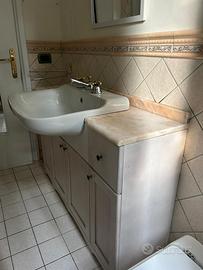Lavabo su mobile bagno. Mobile in legno resistente (quello con cui venivano fatti i mobili una volta per intenderci) con top in marmo. Presenta due cassetti e 3 stipetti. Altezza 82,5 cm (85,5 cm sul lavabo),profondità 36 cm (62 cm sul lavabo) e laghezza 123,5 cm.