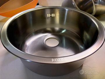 Lavello circolare in acciaio inox di alta qualità a marchio Franke, leader nel settore. Il lavabo è caratterizzato da un design pulito ed essenziale, ideale sia per cucine moderne che per angoli lavanderia o zone bar.