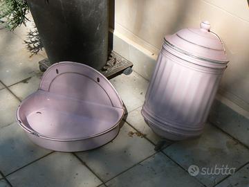Vendo un lavabo sciacquatoio liberty smaltato rosa con filetti dorati composto da un serbatoio per l'acqua con rubinetto e una vasca.
