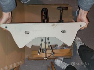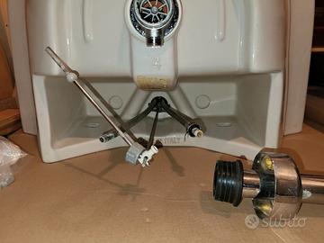 Lavabo sospeso in ceramica Ideal Standard con miscelatore in acciaio Inox Ideal Standard e suo sifone, anch'esso in acciaio Inox. Presenti anche viti per montaggio.