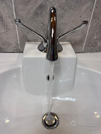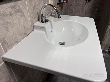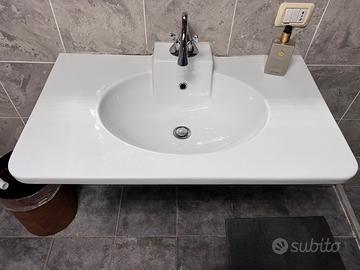 Bianco lucido ceramica, lavabo per bagno sospeso. Viene con rubinetteria miscelatore in acciaio argento. Larga 90 x 53cm Ottimo condizione Disponibile a fino febbraio