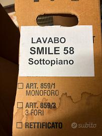 Vendo lavabo in ceramica bianca sottopiano mod. Smile 58 distribuito da Arteba NUOVO MAI MESSO IN FUNZIONE. Ordinato per sostituire quello montato nel mobile da bagno Arteba che poi non e' stato più sostituito.Lato lungo mm. 630. Lato corto mm.490. Altezza massima mm. 190. Altezza della vasca al foro di scarico mm. 146. Imballo oribinale.