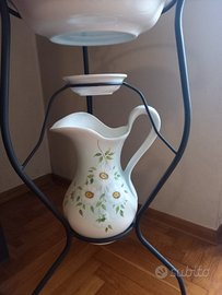 Bellissimo set completo da toilette. Realizzato in ceramica color azzurro cielo con decorazioni floreali dipinte a mano. È composto da quattro pezzi (specchio ovale, brocca, piattino e porta sapone) ed è completo di base in ferro battuto. Dimensioni: altezza della struttura 130 cm; altezza della brocca 34 cm; diametro del catino 39 cm; diametro del portacatin 50 cm; diametro del portasapone 14 cm; diametro del piattino 15 cm. Prezzo negoziabile! Non esitate a contattarci.