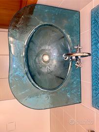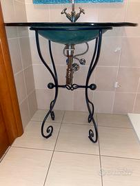 Lavandino in vetro con appoggio in ferro battuto e specchio, completo di rubinetteria e scarico. Unico difetto, presenta segni di usura nel punto attorno allo scarico del lavello