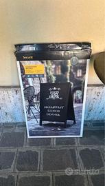 Lavagna a cavalletto in legno esposizione menu, bar, ristorante, negozio Ottime condizioni Lavagna nera da terra a cavalletto con doppia faccia. Cornice in legno duro con tripla laccatura che la rende idonea all'utilizzo anche in esterno. Superficie scrivibile con pennarelli a gesso liquido, antigraffio, resistente ai raggi uv e alle deformazioni dovute al calore. Altezza: 85cm (chiusa) - 81cm (aperta) Larghezza: 54,5cm Profondità: 5,7cm (chiusa) - 44cm (aperta) Peso 4,7 kg.