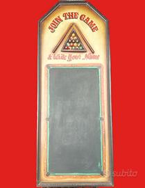 La lavagna è inserita all'interno di una cornice in legno, da usare con i classici gessetti. Rappresenta un tavolo da biliardo con stecche e biglie. E' indicata per arredo tavernette, saloni, birrerie, bar