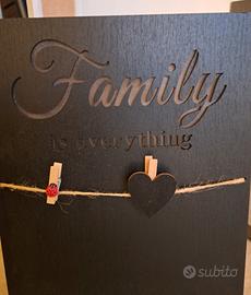 lavagna in legno con scritta family per appendere foto e bigliettini