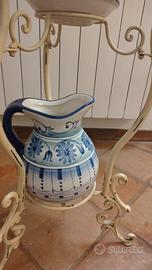 beige in ferro battuto con oggetti bianco e blu e specchio rotondo, antichizzato