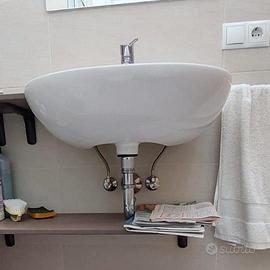 Lavandino classico da muro largo 60cm e profondo 50cm. Comprensivo di piletta di scarico con troppo pieno e miscelatore acqua calda/fredda perfettamente funzionante. Lavandino come nuovo senza alcun graffio o difetto. Prezzo simbolico, no spedizione