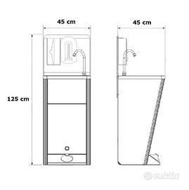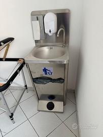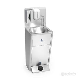 Lavandino autosufficiente ospedaliero realizzato interamente in acciaio inox, l’erogazione avviene tramite un comando a pedale, l’acqua pulita proveniente da un serbatoio interno con capienza da 11 litri, inoltre il lavandino è completo di dosatore di sapone elettronico, porta salviette e getta carte.
