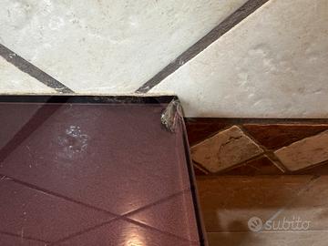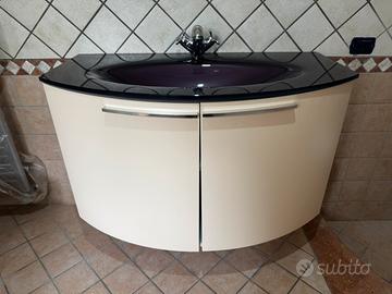 Vendo lavandino sospeso in vetro temperato color melanzana, e mobile a doppia anta, la rubinetteria è esclusa, piletta e sifone incluso, il lavandino nell’angolo destro presenta una piccola lesione causata durante il montaggio ( ormai 6 anni fa) le misure sono : 106 cm di larghezza, 56 cm di profondita nella parte piu grande e 37 cm nella parte meno profonda, alto 61 cm totali