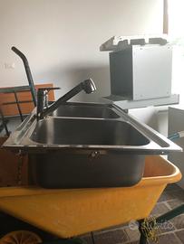 Lavandino per cucina con due vasche, dotato di rubinetto allungabile e dispone gia dei tubi di scarico. Il lato lungo misura 85cm, quello corto 49; profondità 20. Condizioni pari al nuovo, per maggiori informazioni non esitate a contattare