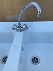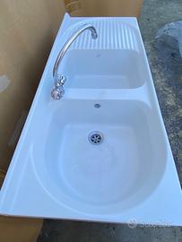 Vendo lavandino in ceramica con doppia vasca e sgocciolatoio completo di mobiletto e rubinetto, lavandino marca Ideal standard, misure: lungo 120 cm., profondo 60 cm. è alto 65 cm.