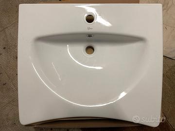 Lavabo in ceramica di colore bianco lucido antibatterico, ergonomico per disabili e anziani, con poggia gomiti e troppo pieno. Predisposto per installazione a parete con tasselli di fissaggio e un supporto metallico compreso. Marca Goman