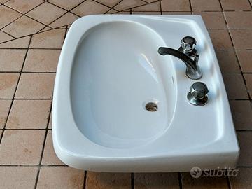 Vendo lavandino in ceramica bianca completo di rubinetteria (acqua calda/fredda) e bocca di erogazione. Perfetto per bagni di servizio, garage, lavanderie, cantine o sostituzioni rapide.