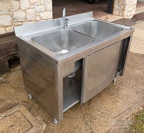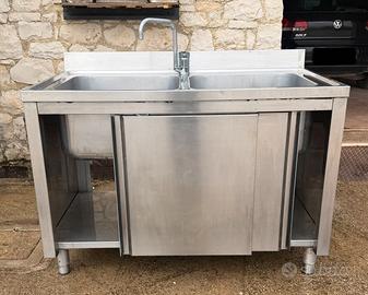Vendo lavandino industriale a doppia vasca realizzato interamente in acciaio inox. Lavello montato su struttura a mobile chiusa, sempre in acciaio e dotata di ante scorrevoli con ampio spazio interno. Oggetto in ottime condizioni, non presenta ammaccature o danni. Misure: Larghezza - 120 cm Profondità - 70 cm Altezza anteriore - 84 cm Altezza con alzatina posteriore - 93 cm