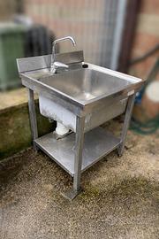 Vendo lavello professionale in acciaio inox 70x70 cm, singola vasca profonda, con alzatina posteriore e ripiano inferiore portaoggetti.