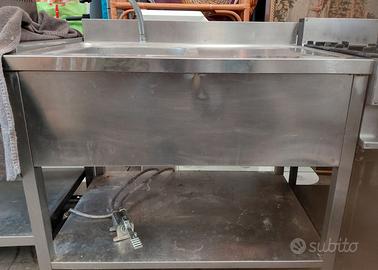 include vasca singola, rubinetteria, pedaliera,sgocciolatoio laterale e ripiano inferiore.Ideale per cucine professionali o lavaggio pentole