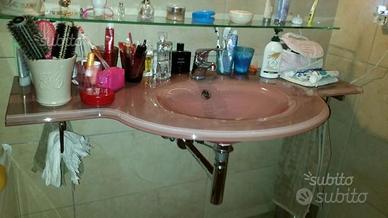 Lavandino in vetro rosa-salmone: usato in condizioni perfette, spessore 2 cm, larghezza totale 121 cm, profondità massima al muro 59 cm al centro e 35 cm ai due lati, i due lati esterni sono larghi 21 cm nella parte rettangolare prima di iniziare la curva sporgente centrale, il foro/conca ovale misura cm 45 x 35; completo di supporti a muro per essere montato a vista come in foto, in aggiunta ripiano in vetro con supporti per fissare a muro; vendo a 100 euro non trattabili. Regalo il miscelatore già fissato+piletta+sifone. Roberto 3287661944, Trento - martignano.
