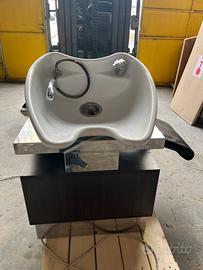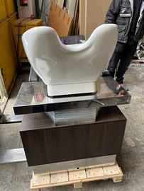 Mobile in legno scuro, porta vasca in ceramica bianco con top in acciaio.