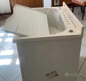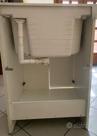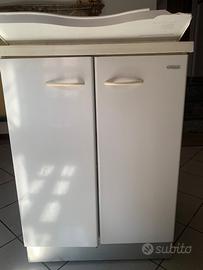 Lavatoio Montegrappa con vasca in termoplastico di grande capacità e robustezza. Mobile-lavatoio a 2 ante, dimensioni (L x P x H): 60 x 50 x 85 cm., in ottime condizioni. Colore: bianco. La vasca presenta segni di usura, ma si può pulire o sostituire. L’asse in termoplastico ha uno spigolo danneggiato.