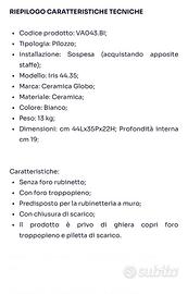 Vendo Pilozzo NUOVO sospeso bianco 44x35 serie Iris di Ceramica Globo con foro troppopieno e piletta in ottone. Allego foto e descrizione come da sito.