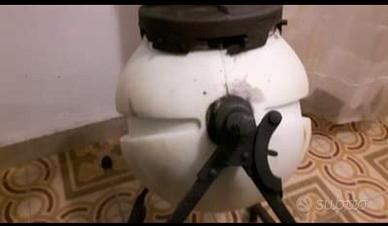 Vendo questa ruspante lavatrice a mano marca KARIN, mancante di manovella (comunque facilmente riproducibile): cestello in resina bianco crema, telaio in metallo nero e presa coperchio ermetico in bachelite.