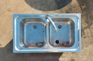 4 lavelli in acciaio doppia vasca, misure: 91x60 116x50 79x50 86x50 2 lavelli in plastica bianca monovasca, misure: 70x50