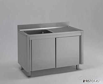 A richiesta, ordinabile anche con 2 vasche, armadiato, con gocciolatoio a sbalzo per inserimento lavastoviglie - lavabicchieri.