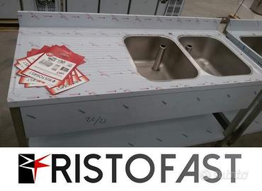 Realizzato in acciaio inox. Vasche insonorizzate con angoli arrotondati complete di piletta e troppo pieno. Piano di lavoro con invaso perimetrale e gocciolatoio inclinato. Alzatina posteriore paraspruzzi ricavata dal piano. Fasce coprivasca. Ripiano inferiore con omega di rinforzo. Gambe in tubolare quadro (40x40) dotate di piedini di livellamento.