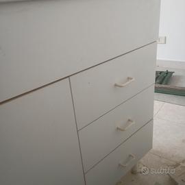 lavello in ceramica con due vasche e sgocciolatoio, completo di mobiletto bianco con due ante e tre cassetti. Il mobiletto è un po' rovinato nella parte posteriore interna. Ritiro a carico dell' acquirente