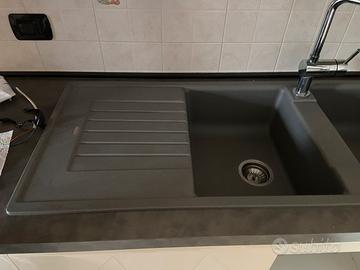 Lavello cucina 2 vasche piu sgocciolatoio in granito grigio. Marca Blanco. Completo di gruppo miscelatore. Misure: Lunghezza Sgocciolatoio 40 cm Lunghezza complessiva 115 cm Lunghezza vasca 33 cm Profondità 50 cm
