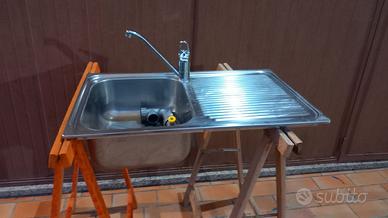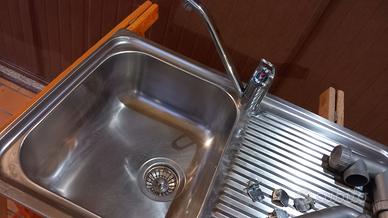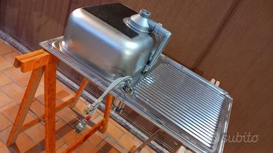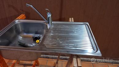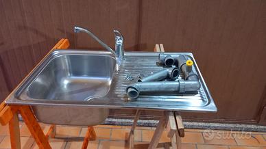 Lavello da cucina con vasca a sinistra, da incasso, completo di rubinetteria a misceltatore acqua calda e fredda, tappo di chiusura rapido con filtro e tubi di raccordo agli attacchi dell'acqua, completo di accessori per allacciamento allo scarico, tubo con possibilità di aggancio scarico lavastoviglie, compresi ganci di fissaggio al piano cucina - larghezza 79 cm, profondità 50 cm - usato, ottimo stato - smontato da cucina perfettamente funzionante - disponibile anche piano cottura a gas GPL forno a gas GPL - come da foto - [qw 9965] -