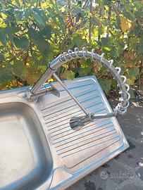 Include rubinetto miscelatore flessibile professionale in acciaio, completo di tubi di collegamento e scarico.