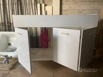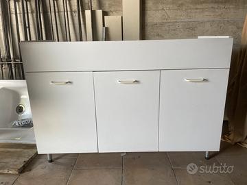 Lavello bianco in ceramica a doppia vasca con scolatoio e mobiletto a tre ante cm 120x50 completo di rubinetto a muro e raccordo per scarico.