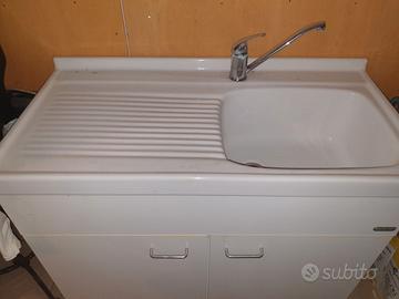 GEROMIN - Lavello in ceramica bianca con 1 vasca più gocciolatoio. Mobiletto bianco in legno a due ante. Dotato di rubinetto. Dimensioni lavello: 100 x 50 Dimensione mobiletto: 97 x 47