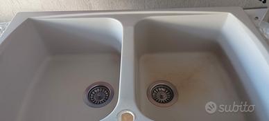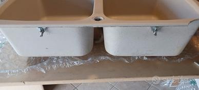Vendo lavello in fragranite (pietra agglomerata) beige marca Elleci. Danneggiato un angolo che si può incollare una volta inserito nella base. Completo di tappi di scarico. Vasche in buono stato. Solo ritiro a mano. Non spedisco.