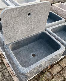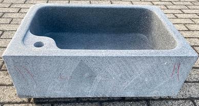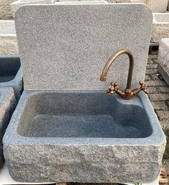 E' scavato da un massello di diorite, è molto più resistente e durevole del marmo e della pietra. Non è di cemento, graniglia o polvere di marmo. Non soffre il gelo, ed è ideale sia per interni che per esterni. La superficie: Interni: finemente levigata, con il trattamento idrorepellente, angoli arrotondati. Esterni: tre lati a spacco e spazzolati, lato posteriore e fondo a taglio. Le dimensioni : Esterno cm 60x40xh20, interno 52x33xh16.5/17.5. Il foro di scarico per piletta 1-1/4" standard, con o senza foro (d3.5) per rubinetto. Il peso: 60 kg circa. Ottima la pendenza del fondo per lo scarico. Sono disponibili altre foto. Vedasi anche l'annuncio per la versione per esterni più economica. Optional: - Para schizzi cm 58xh40xsp.2, con o senza foro (d4) per rubinetto: 48 euro. - Coppia di sostegni in ferro battuto, zincato caldo e verniciato: 98 euro/coppia. Rubinetteria in ottone brunito MADE IN ITALY: - Miscelatore girevole da appoggio o da parete: 158 euro. - Rubinetto girevole da appoggio con la prolunga in acciaio inox: 72 euro. - Rubinetto da parete: 25 euro. - Piletta 1-1/4": 20 euro. - Sifone 1-1/4": 30 euro. Vedasi anche l'annuncio per la versione per esterni più economica. Il deposito si trova a 2 km dal casello di Casalpusterlengo sull'autostrada A1, a circa 50 km da Milano. Non siamo sempre presenti in magazzino. Per visionare i prodotti è necessario fissare un appuntamento. IVA inclusa. E' necessario P.IVA o cod. fiscale per regolare i documenti. ************************************************ Sono disponibili anche i seguenti modelli e misure, vedasi gli annunci relativi: - Con una o due vasche + piano scolapiatti: dim.: cm120, 100, 90 e 80. - Con una vasca e senza piano: dim.: cm90, 80, 70 e 50 . - Ricavato dall'antica mangiatoia: dim.: cm40-110. Visita il ns. negozio clic pulsante "Vai allo shop" in fondo alla pagina. Troverete altri bellissimi articoli.