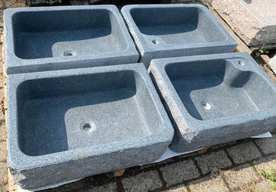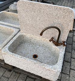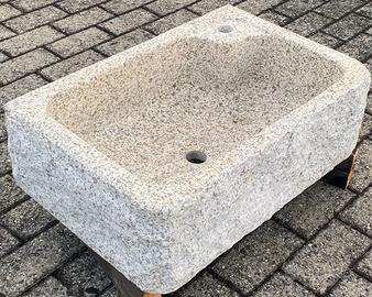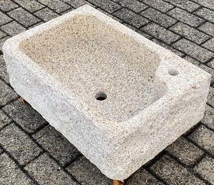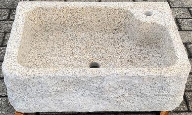 E' scavato da un massello di granito beige, è molto più resistente e durevole del marmo e della pietra. Non è di cemento, graniglia o polvere di marmo. Non soffre il gelo ed è ideale sia per interni che per esterni. La superficie: Interni: finemente levigata, con il trattamento idrorepellente, angoli arrotondati. Esterni: tre lati a spacco e spazzolati, lato posteriore e fondo a taglio. Le dimensioni : Esterno cm 60x40xh20, interno 52x32xh16.5/17.5. Il foro di scarico per piletta 1-1/4" standard, con foro (d3.5) per rubinetto. Il peso: 60 kg circa. Ottima la pendenza del fondo per lo scarico. Sono disponibili altre foto. Optional: - Para schizzi cm 58xh40xsp.2, con o senza foro (d4) per rubinetto: 48 euro. - Coppia di sostegni in granito 38xh60: 98 euro/coppia. - Coppia di sostegni in ferro battuto, zincato caldo e poi verniciato: 98 euro/coppia. Rubinetteria in ottone brunito MADE IN ITALY: - Miscelatore girevole da appoggio o da parete: 158 euro. - Rubinetto girevole da appoggio con la prolunga in acciaio inox: 72 euro. - Piletta 1-1/4": 20 euro. - Sifone 1-1/4": 30 euro. Vedi anche gli annunci per la versione più economica per esterni. Il deposito si trova a 2 km dal casello di Casalpusterlengo sull'autostrada A1, a circa 50 km da Milano. Non siamo sempre presenti in magazzino. Per visionare i prodotti è necessario fissare un appuntamento. IVA inclusa. E' necessario P.IVA o cod. fiscale per regolare i documenti. ************************************************ Sono disponibili anche i seguenti modelli e misure, vedasi gli annunci relativi: - Con una o due vasche + piano scolapiatti: dim.: cm120, 100, 90 e 80. - Con una vasca e senza piano: dim.: cm90, 80, 70 e 50 . - Ricavato dall'antica mangiatoia: dim.: cm40-110. Visita il ns. negozio clic pulsante "Vai allo shop" in fondo alla pagina. Troverete altri bellissimi articoli.