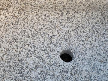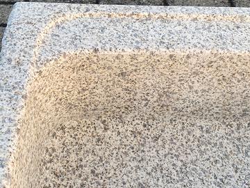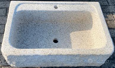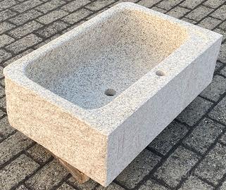 E' scavato da un massello di granito beige, è molto più resistente e durevole del marmo e della pietra. Non è di cemento, graniglia o polvere di marmo. Non soffre il gelo ed è ideale sia per interni che per esterni. La superficie: Interni: finemente levigata, con il trattamento idrorepellente, angoli arrotondati. Esterni: tre lati a spacco e spazzolati, lato posteriore e fondo a taglio. Le dimensioni : Esterno cm 70x45xh20, interno 62x32xh17/18.5, con foro per rubinetto d.3.5. Il peso: 95 kg circa. Il foro di scarico per piletta 1-1/4" standard. Ottima la pendenza del fondo per lo scarico. Disponibile anche la versione senza foro per rubinetto (le foto nr. 9-10) , interno 62x37xh17/18.5, pesa 82 kg circa, 525 euro, vedi l'annuncio specifico. Sono disponibili altre foto. Optional: - Para schizzi cm 68xh40xsp.2: 48 euro. - Coppia di sostegni in granito, cm 43xh60, pesa 98kg/coppia, 115 euro/coppia. - Coppia di sostegni in ferro battuto, zincato caldo e verniciato: 98 euro/coppia. Rubinetteria in ottone brunito MADE IN ITALY: - Miscelatore girevole da parete o da appoggio: 158 euro. - Rubinetto girevole da appoggio con la prolunga in acciaio inox: 74 euro. - Piletta 1-1/4": 20 euro. - Sifone 1-1/4": 30 euro. Il deposito si trova a 2 km dal casello di Casalpusterlengo sull'autostrada A1, a circa 50 km da Milano. Non siamo sempre presenti in magazzino. Per visionare i prodotti è necessario fissare un appuntamento. IVA inclusa. E' necessario P.IVA o cod. fiscale per regolare i documenti. ************************************************ Sono disponibili anche i seguenti modelli e misure, vedasi gli annunci relativi: - Con una o due vasche + piano scolapiatti: dim.: cm120, 100, 90 e 80. - Con una vasca e senza piano: dim.: cm90, 80, 60 e 50 . - Ricavato dall'antica mangiatoia: dim.: cm40-110. Visita il ns. negozio clic pulsante "Vai allo shop" in fondo alla pagina. Troverete altri bellissimi articoli.