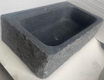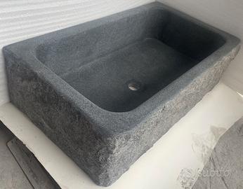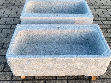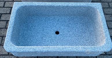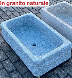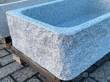 E' scavato da un massello di granito grigio chiaro, è molto più resistente e durevole del marmo e della pietra. Non è di cemento, graniglia o polvere di marmo. Non soffre il gelo ed è ideale sia per interni che per esterni.